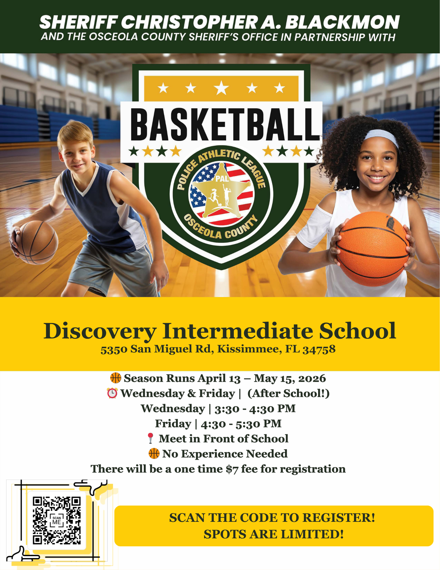 I am excited to share that we have partnered with the Osceola Sheriff's Department to provide an after-school sports program for our students. This is a great opportunity for your student to work on their athletic skills while building character. Please use the QR code in the flier to sign your student up. If you have any questions, please reach out and we will help answer any questions for you.